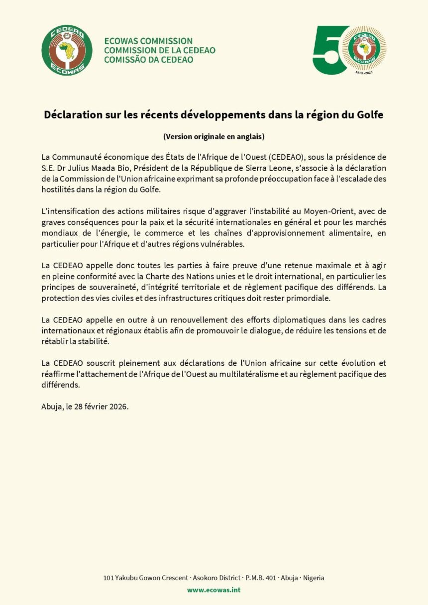 أعربت المجموعة الاقتصادية لدول غرب إفريقيا (إيكواس) عن قلقها من التداعيات المحتملة للتصعيد العسكري في الشرق الأوسط، محذّرة من أن استمرار المواجهات قد ينعكس بشكل مباشر على الاستقرار الدولي، ويؤثر على أسواق الطاقة والتجارة العالمية وسلاسل الإمداد الغذائي، خصوصًا في القارة الإفريقية التي تعتمد بدرجة كبيرة على الواردات.