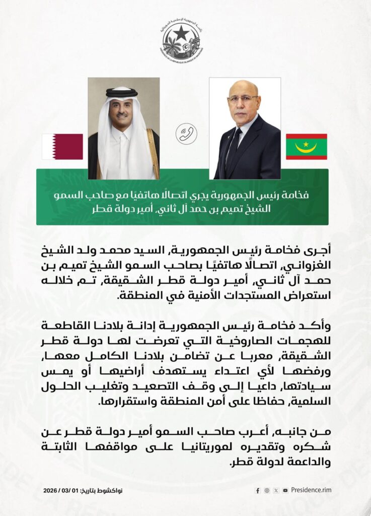 أجرى رئيس الجمهورية، السيد محمد ولد الشيخ الغزواني، اتصالاً هاتفياً بصاحب السمو الشيخ تميم بن حمد آل ثاني، أمير دولة قطر الشقيقة، تم خلاله استعراض المستجدات الأمنية في المنطقة. وجدد رئيس الجمهورية إدانة بلادنا القاطعة للهجمات الصاروخية التي تعرضت لها دولة قطر، مؤكداً تضامن موريتانيا الكامل ورفضها لأي اعتداء يمس سيادتها.