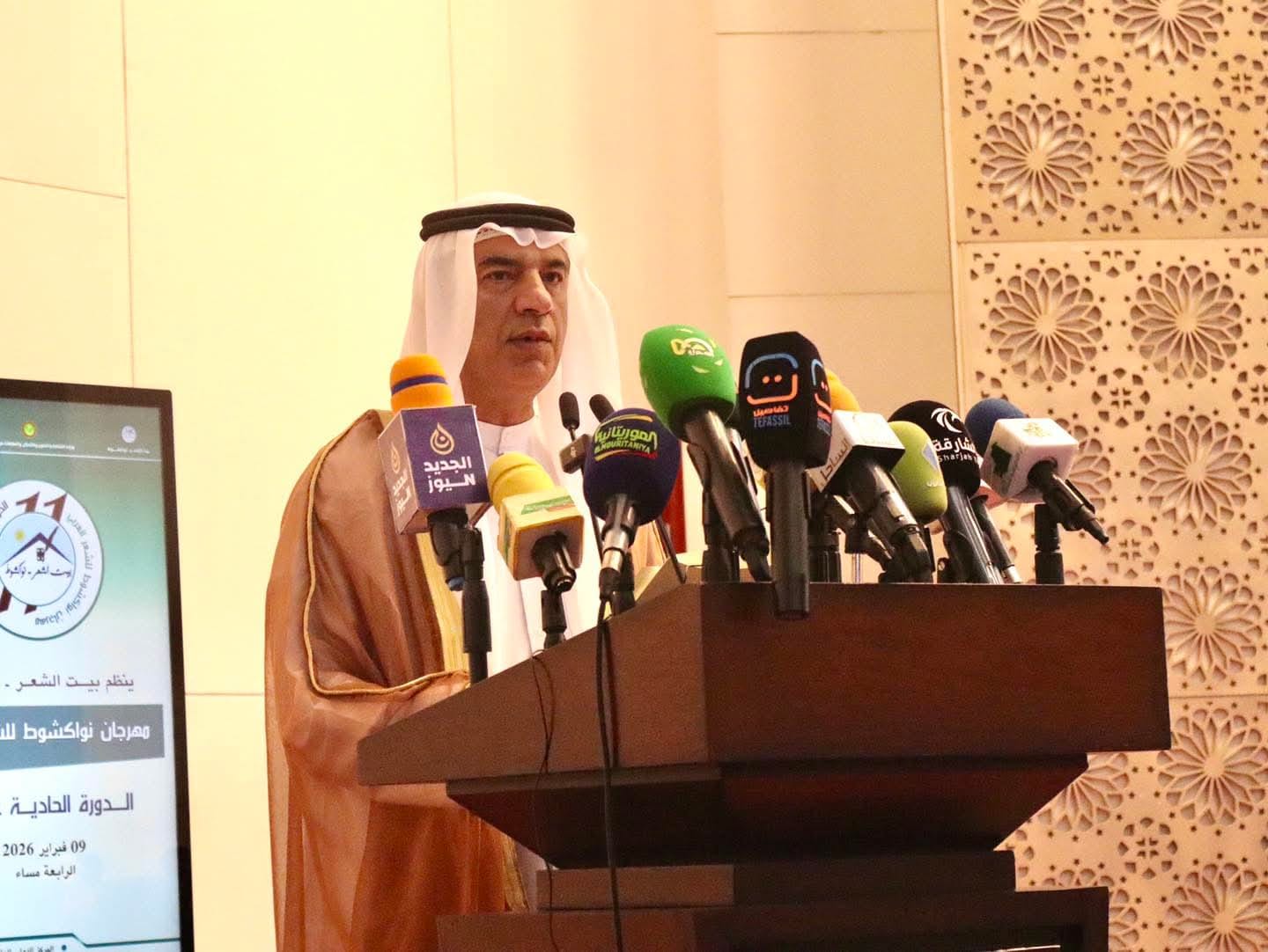 وفي كلمة افتتاح المهرجان، رحّب معالي وزير الثقافة والفنون والاتصال والعلاقات مع البرلمان بوفد إمارة الشارقة، ممثلاً في سعادة عبد الله العويس رئيس دائرة الثقافة، والأستاذ محمد إبراهيم القصير مدير الشؤون الثقافية بالدائرة، معرباً عن شكره لمواكبتهم المستمرة للمهرجان. وأكد معاليه أن التعاون الثقافي بين موريتانيا والشارقة يعكس رؤية مشتركة تعتبر الشعر ذاكرة الأمة وهويتها وجسرًا للتواصل بين الحضارات العربية والعالم.